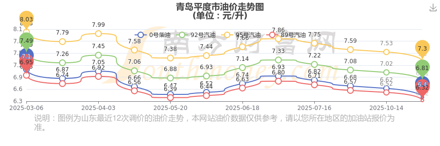 11月1日的青岛平度市汽油、柴油每升最新价格(调整时刻为10月28日):92号汽油为6.81元,下跌了0.21元,下跌幅达2.99%;95号汽油为7.3元,下跌了0.23元,下跌幅达3.05%;89号汽油为6.32元,下跌了0.2元,下跌幅达3.07%;0号柴油为6.4元,下跌了0.22元,下跌幅达3.32%。