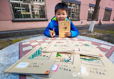 近来,杭州南肖埠小学三年级学生郑嘉南的爸爸将书皮玩出了新花样!复古感十足的牛皮纸上,丰子恺漫画素雅大方,再配合一句小诗,书卷气味扑面而来。校方介绍,心灵手巧的家长名叫郑刚,是校园的一名体育老师,他的足球课十分精彩,书画自怨自艾业余爱好。